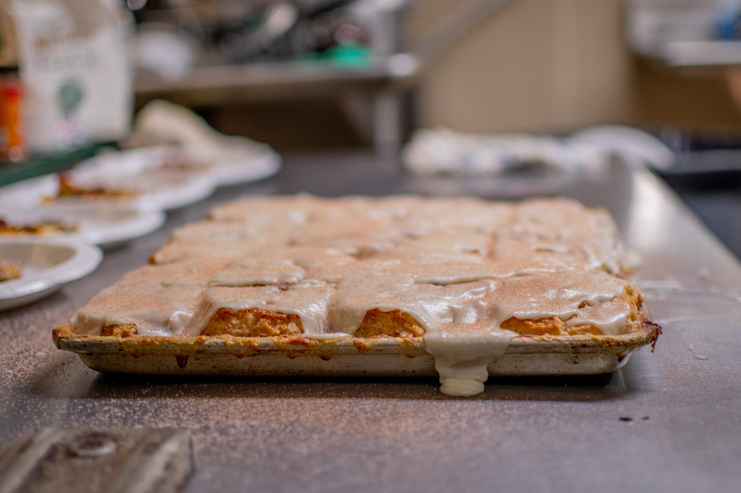 • In a greased casserole pan add your cinnamon rolls cut side up to the bottom of pan. They should be touching in the your baking dish